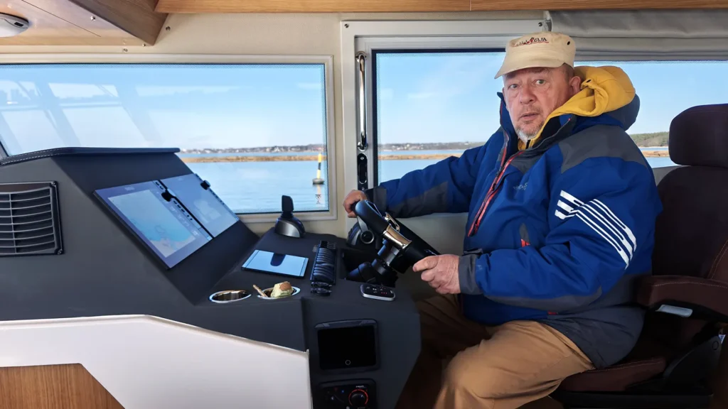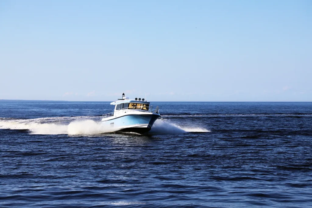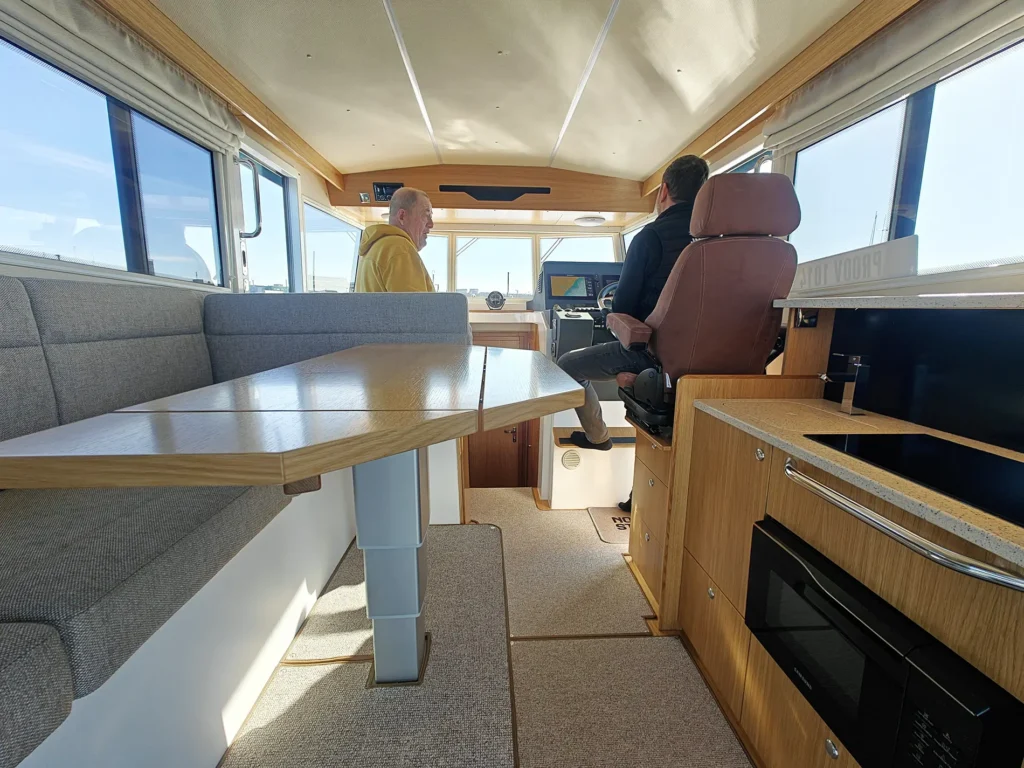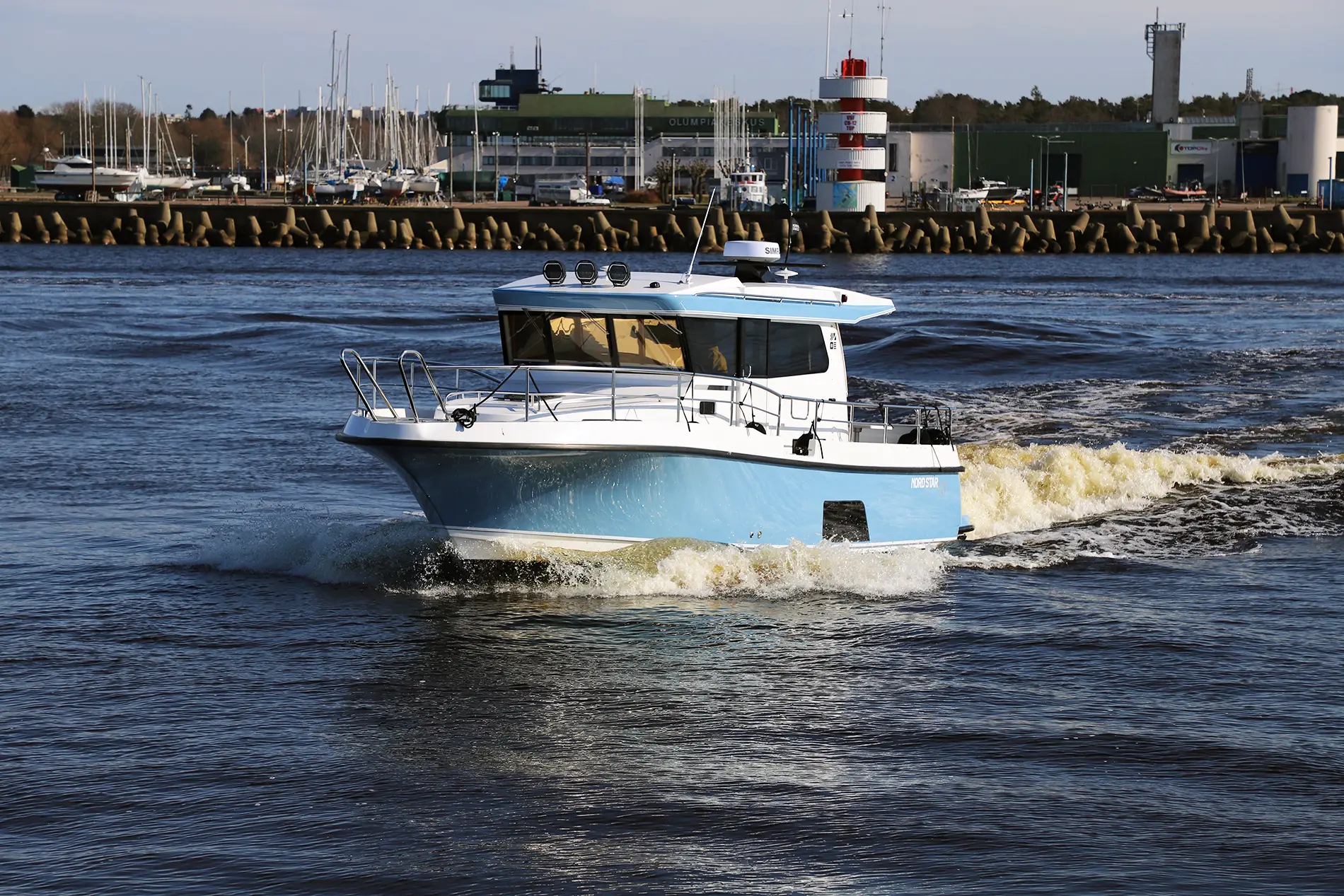 Kuidas Nord Star 33+ sõidab? Meie proovisõidupaadi jõuallikateks olid 2 X Volvo D4 veojalgadega diiselmootorid, mis veel kümmekond aastat tagasi sellise suurusega paadil olnuks ainuõige lahendus. Täna on võimsad rippmootorid teinud kuni 15-meetriste paatide puhul revolutsiooni ja Nord Star 33+ on võimalik saada ka rippmootoritega versioonina. Diiselmootorid on võrreldes bensiinil töötavate rippmootoritega igal juhul ökonoomsemad ja nende poolt tarbitavate liitritega on sõiduulatus ka pikem. Kahe sisediisliga Nord Star liigub reipalt ega ole ülearu lärmakas. Nagu kiuste oli meie proovisõidupäeval peaaegu tuuletu ilm. JMK Marine juhi Kalle Kütti sõnul oleks Nord Stari head sõiduomadused esile tulnud just tuulisema ilmaga.